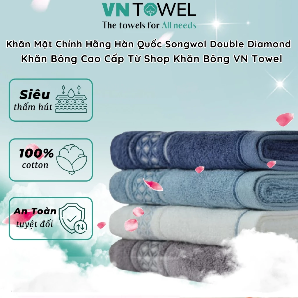 Khăn mặt chính hãng Hàn Quốc Songwol Double Diamond – là sản phẩm cao cấp được phân phối bởi Khăn bông Vntowel, mang đến trải nghiệm sử dụng mềm mại – thấm hút vượt trội – bền đẹp theo thời gian. Nhờ chất liệu sợi tre BBY30S/2 kết hợp cotton 30S/2, khăn không chỉ êm dịu cho da, mà còn giúp hút nước nhanh, tạo cảm giác khô thoáng tức thì.